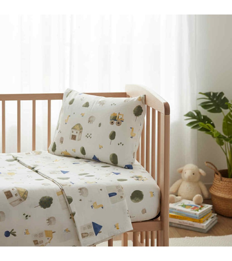 Βρεφικό σετ σεντόνια, εμπριμέ με χαρούμενα χρώματα και μοντέρνες βρεφικές παραστάσεις, 3 τεμαχίων που περιέχει: 2τεμ. βρεφικά σεντονάκια κούνιας, διαστάσεων 120X160 cm και 1 τεμ. μαξιλαροθήκη, διαστάσεων 35X45 cm.