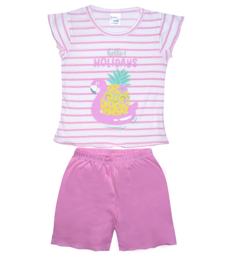 Το σετ περιλαμβάνει μπλούζα με ελαστική λαιμόκοψη και διακοσμητικό καλοκαιρινό τύπωμα στο στήθος χωρίς τοξικές ουσίες, και κοντό παντελονάκι.