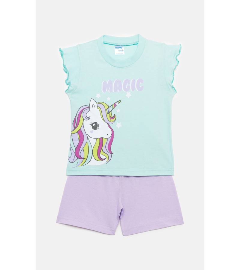 Το σετ περιλαμβάνει μπλούζα με ελαστική λαιμόκοψη και διακοσμητικό καλοκαιρινό τύπωμα στο στήθος χωρίς τοξικές ουσίες, και κοντό παντελονάκι.
