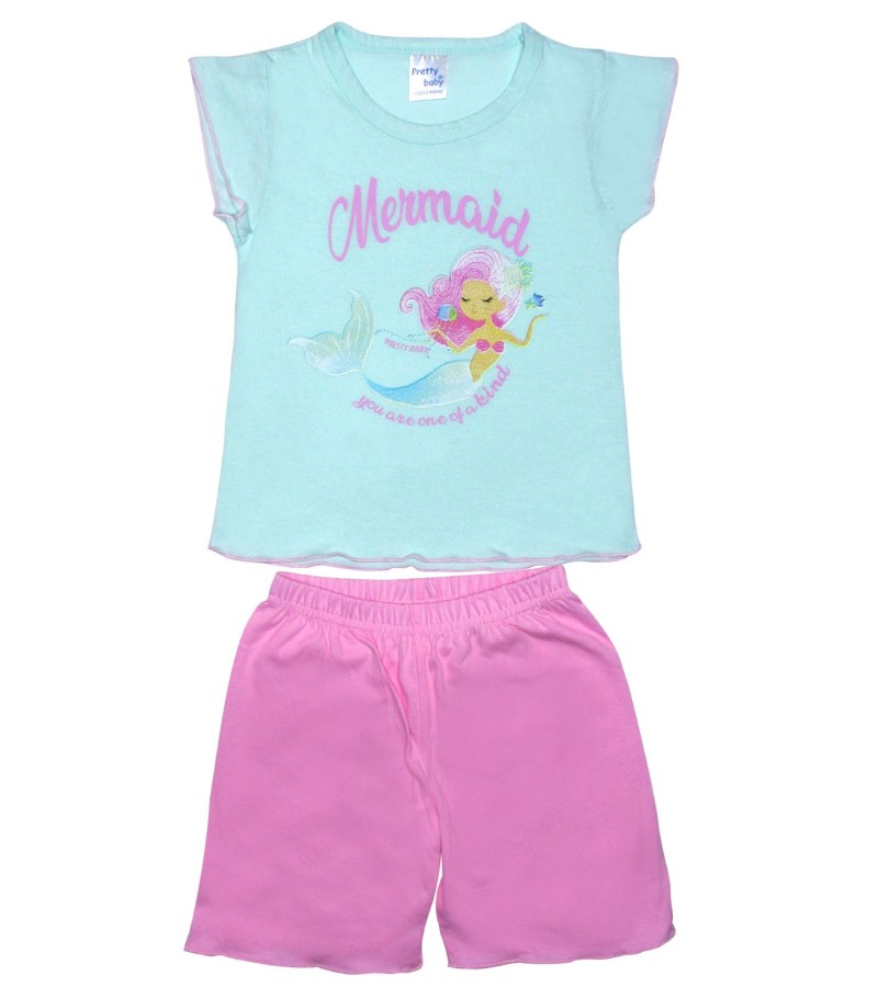 Το σετ περιλαμβάνει μπλούζα με ελαστική λαιμόκοψη και διακοσμητικό καλοκαιρινό τύπωμα στο στήθος χωρίς τοξικές ουσίες, και κοντό παντελονάκι.